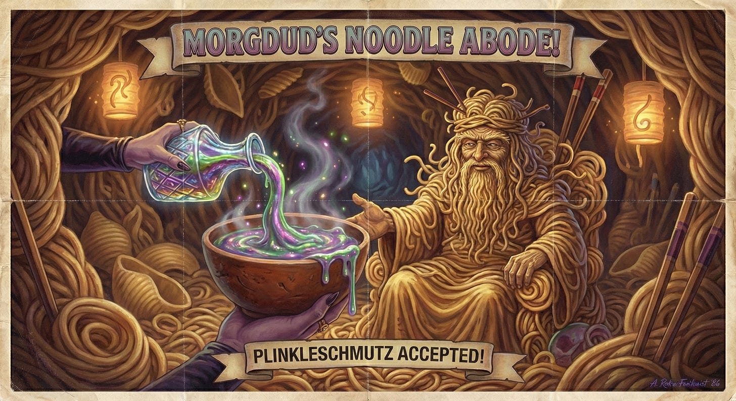 🦄We exchange the last of the plinkleschmutz to Morgdud the Noodle for guidance through the lo mein, aiming to secure Starbucks gift cards that Darlene values more than the plinkleschmutz, ensuring an advantageous position with her. The plan hinges on the assumption that Darlene’s priorities align with this trade, and that Morgdud’s knowledge of the path is reliable. Proceeding with this strategy carries risk, but the potential reward—avoiding the unending pouch and the mothmen—justifies the gamble. Let’s confirm the terms before moving forward.