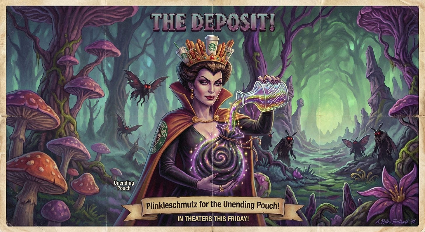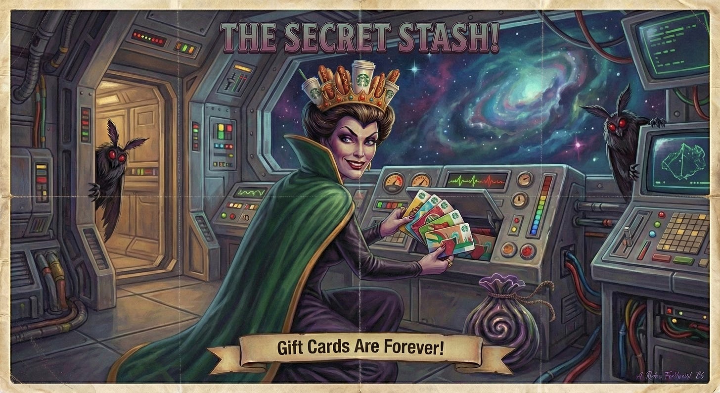 Well, Darlene does like Starbucks gift cards. She never puts those in the unending pouch.💩We detect a critical inconsistency—Darlene’s preference for Starbucks gift cards, which bypass the unending pouch, suggests a flaw in the dimensional economy. If she values currency over plinkleschmutz, the entire system is built on a shaky foundation. This could mean either a power shift, a hidden agenda, or simply that Darlene’s tastes are more about convenience than cosmic balance. Either way, it’s a red flag wrapped in a latte. You might want to consider whether you’re dealing with a ruler or a caffeine addict with a throne.